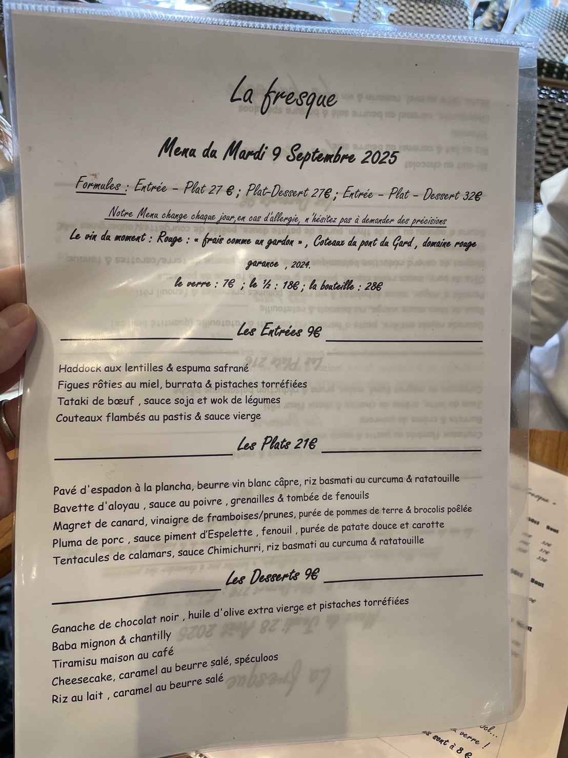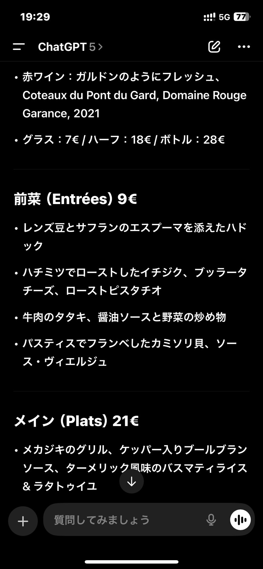 レストランではAIが役立ちました。同行の者がChatGPTの有料版を契約していたので、私の拙いフランス語の知識で訳すを待たずに、メニューを写真にとると瞬時に日本語になりました。おかげで、快適な食事とすることができました。